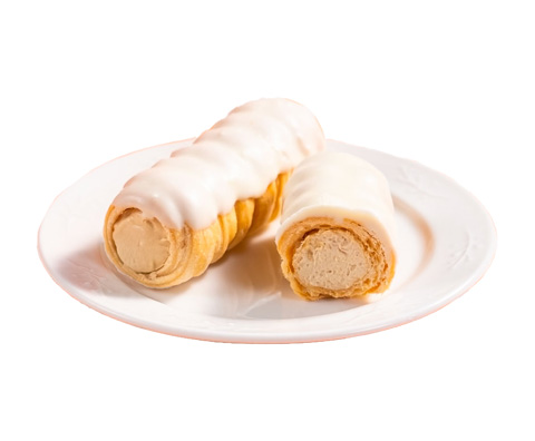 専用生地を使用したコルネに塩キャラメルクリームをIN。ホワイトチョコレートでコーティングして仕上げました。塩味が甘さを引き立てます。 |