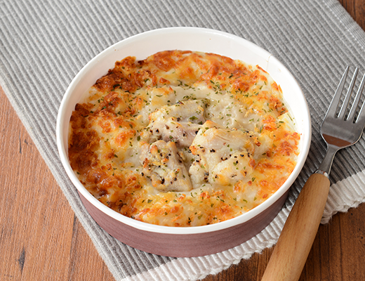 ホワイトソースとポルチーニクリームソースの組み合わせを楽しむチキングラタン。 |