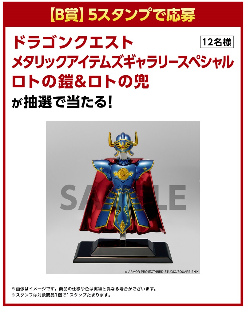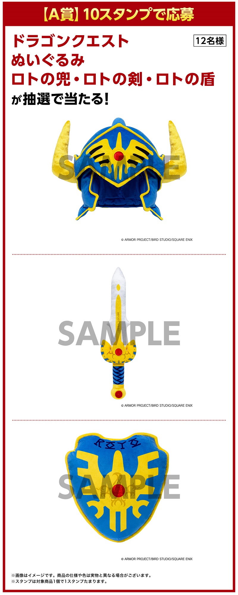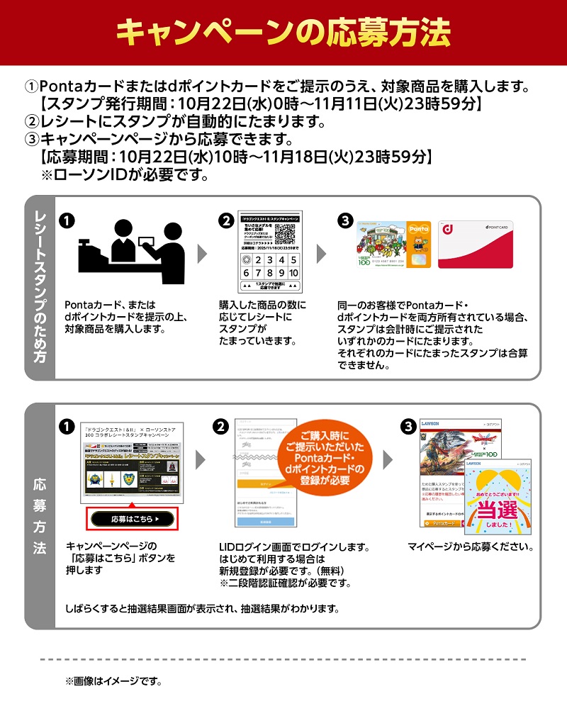 スタンプをためて応募すると、抽選で「ドラゴンクエスト」のグッズ、またはローソンストア100で使用できるクーポンが当たります。