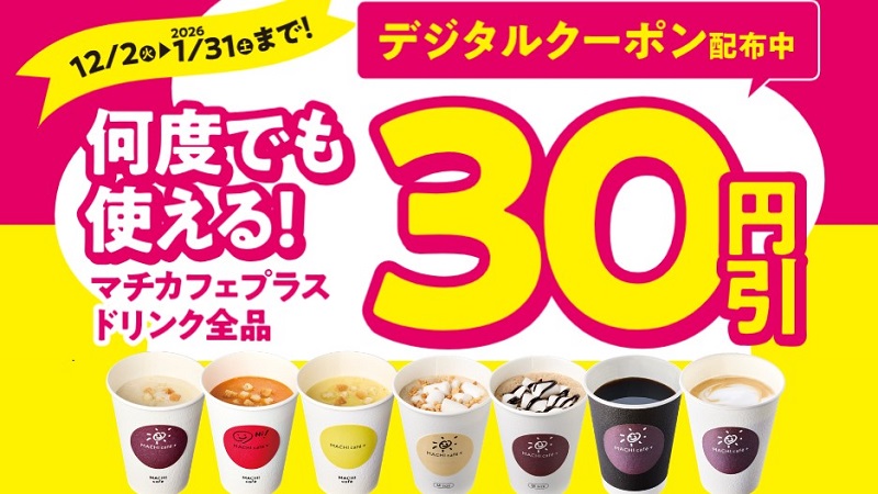 レジで提示すると、マチカフェプラスドリンク各種が30円引になるデジタルクーポン配信中!