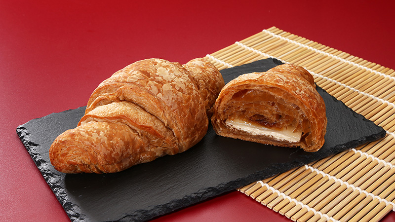 黒みつに桔梗信玄餅をイメージしたもちもちの求肥、程よい甘さのきなこホイップをクロワッサンにサンドしました。和と洋が楽しめる菓子パンです。