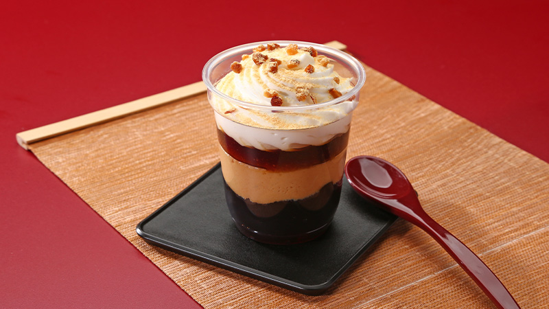 程よい甘さの黒みつゼリーと香ばしいきなこムースを合わせた、夏にぴったりのさっぱりとした和風パフェです。