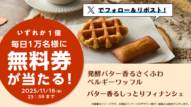 11月12日(水)スタート♪毎日1万名様に抽選で「発酵バター香るさくふわベルギーワッフル・バター香るしっとりフィナンシェ」無料券をプレゼント!