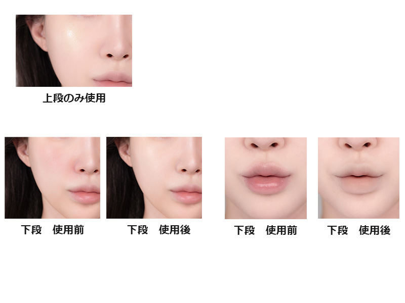 下の濃い目の色は、頬や小鼻など赤みが気になるところを自然に落ち着かせるコンシーラーとして、また、リップの発色を引き出すカラーリップベースとして活躍するアイテムです。