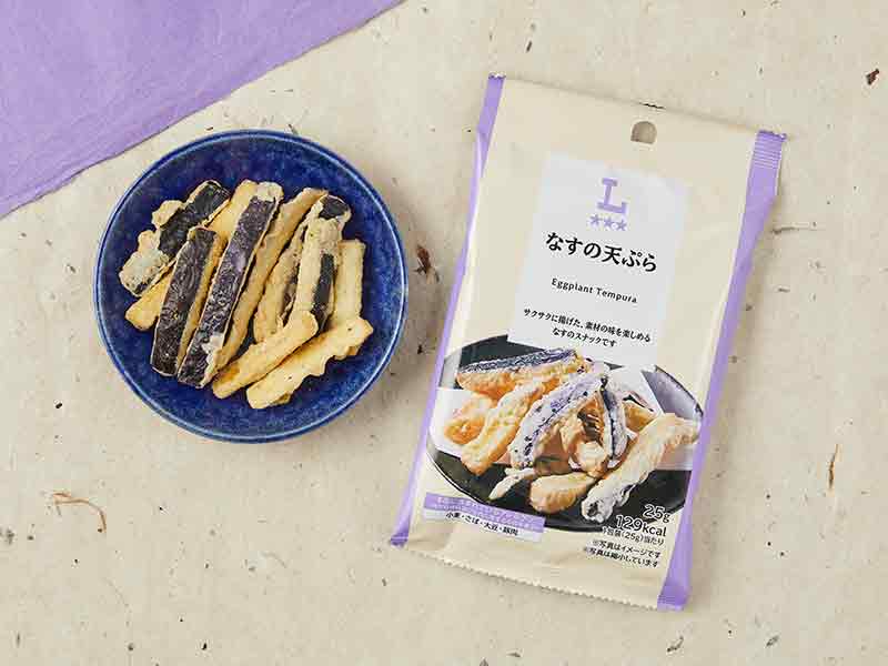 素材の旨味が凝縮されたなすの天ぷらのスナックです。