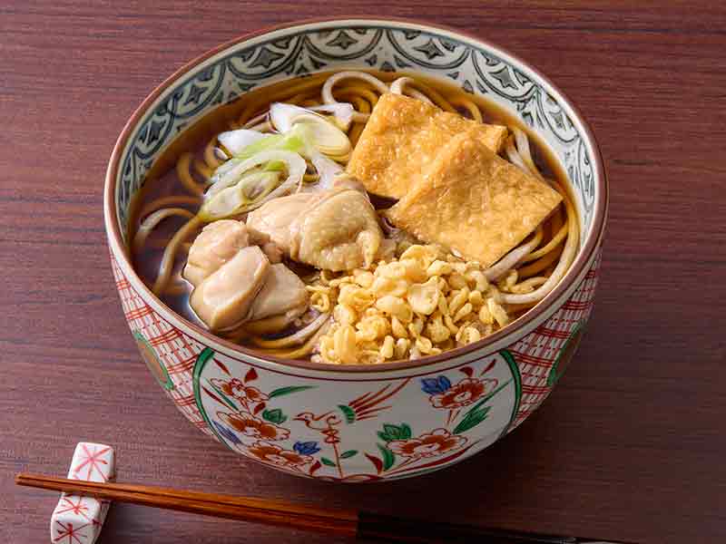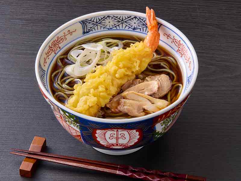 更科特有の角のある太めのそばに出汁の効いたつゆを合わせ、定番のたぬきにダシで煮込んだ鶏もも肉を組み合わせました。