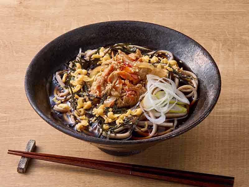甘めのつゆに特製ラー油を入れ、味付けした豚肉と玉ねぎ煮をトッピングしました。