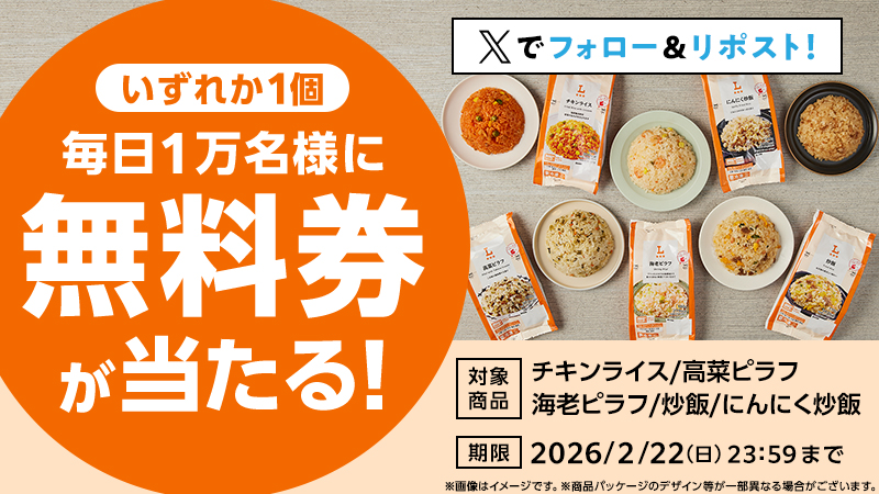 2月18日(水)スタート♪毎日1万名様に抽選で「ローソンオリジナル冷凍米飯 チキンライス・高菜ピラフ・海老ピラフ・炒飯・にんにく炒飯」無料券をプレゼント!