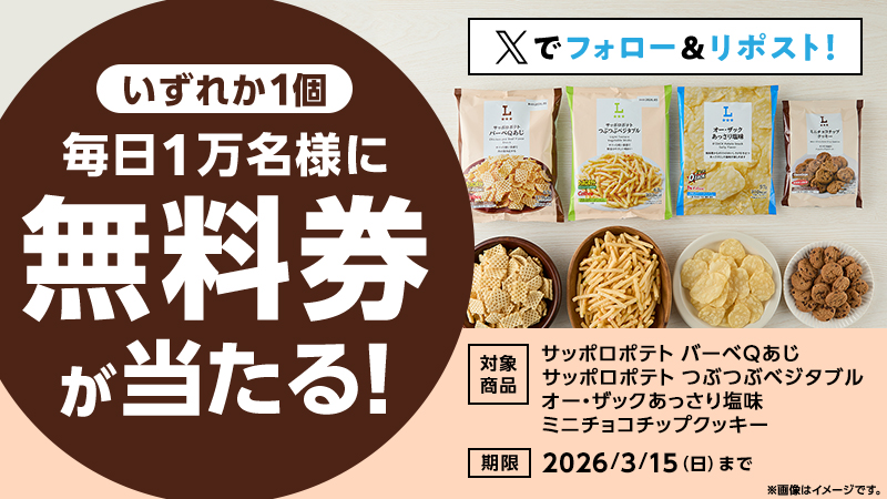 3月11日(水)スタート♪毎日1万名様に抽選で「対象のローソンオリジナル菓子」無料券をプレゼント!