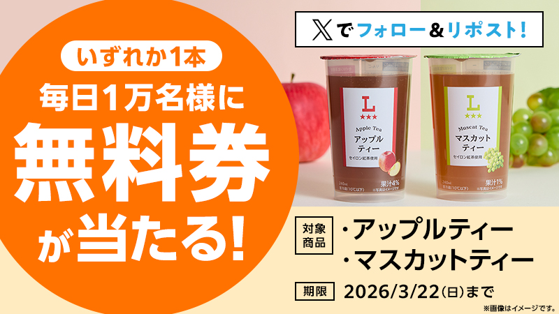 3月18日(水)スタート♪毎日1万名様に抽選で「ローソンオリジナルアップルティー・マスカットティー」無料券をプレゼント!