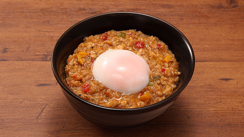 とろ~りとした半熟たまごが味にまろやかさとコクをプラス。ピリ辛の味付けとバジルの香りが食欲をかき立てます。
