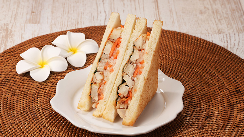 なますの甘酸っぱさとパクチーが香るバインミー風のサンドイッチです。