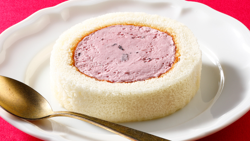 白い生地に北海道産ハスカップ、クリームチーズを使った2層のクリームで仕上げたロールケーキです。