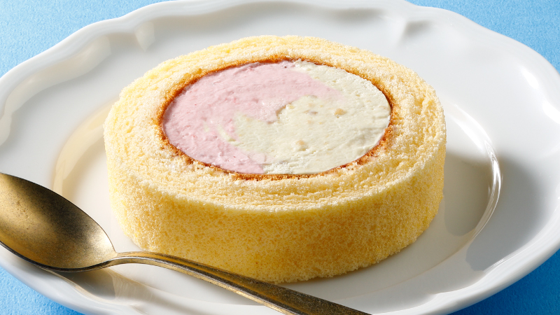 バナナ風味&いちご風味の2種のクリームを合わせたババヘラアイス風のロールケーキです。