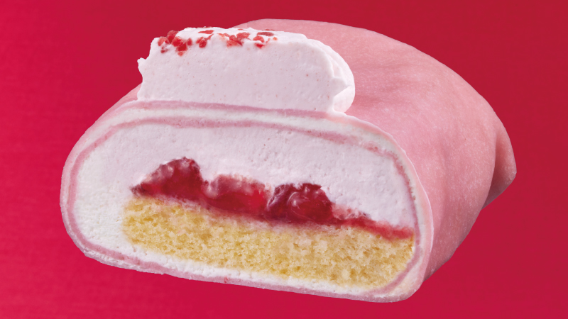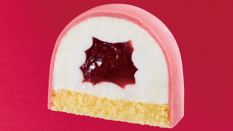 いちごソース入りのミルククリームに、さらにコーティングチョコを上掛けしたドーム状のケーキです。