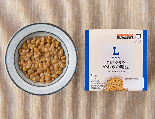 においが少なく、食感がやわらかく、糸引きがあっさりした納豆です。日高産昆布と枕崎産かつおを使用した「うまみだしたれ」を添付しています。
