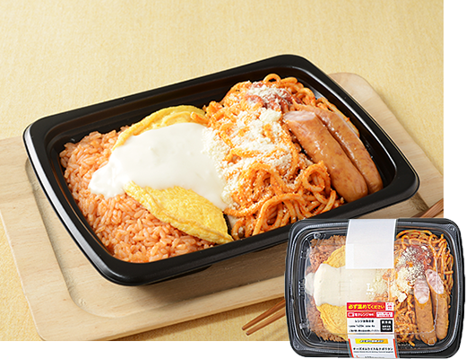チーズオムライスとナポリタンのご飯と麺が1つで二度美味しい、1,000kcalオーバーのボリューム弁当です。