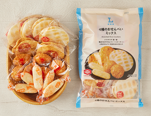 ソフトサラダ・揚一番・亀田のまがりせんべい・ハッピーターン。人気おせんべいを詰め合わせしました。