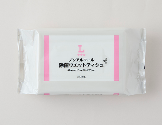 除菌ができるノンアルコールタイプのウェットティシュ。大容量80枚入で、ご家庭でも外出先でも気軽に使用できます。身のまわりのものの除菌、キッチン・食卓まわりのふき取りも。日本製。