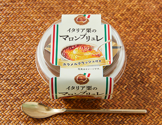 イタリア栗を使用したプリンにカラメルをかけて食べる、食感を楽しめるデザート。