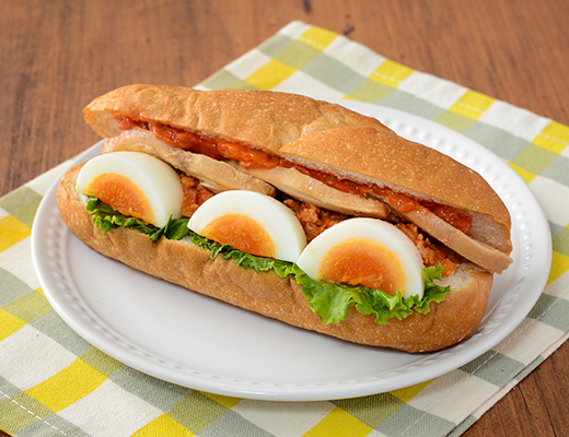 ソフトフランスパンに、ローストチキンやたまご、グリーンリーフをはさんで、トマト入りチリミートソースを合わせました。美味しくたんぱく質を摂ることができます。