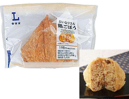 手軽に食べられる個食タイプのいなり寿司。鶏そぼろ・ごぼう・油揚げ・ごまを混ぜ込んだ醤油味の酢飯を、ふわっとやわらかないなり皮で包みました。