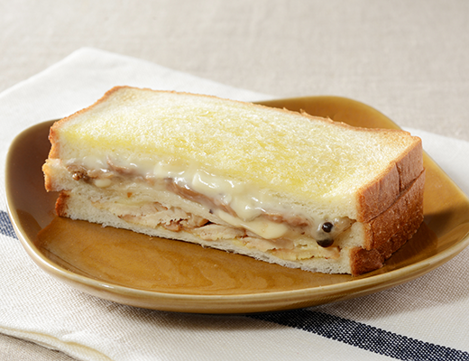 エリンギ、しめじ、マッシュルームの3種のきのこが入ったホワイトソースとチキンをサンドし、チーズソースと合わせました。