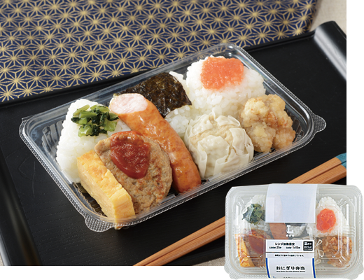 小さめのおにぎり(明太子・野沢菜・海苔付き塩飯の3種類)とシューマイ、玉子焼、鶏唐揚げ、ウインナー、ハンバーグといったおかずが揃った食べ応えのある弁当です。