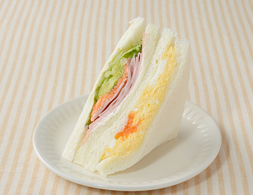 野菜層はレタスをメインにハムとにんじんを、たまご層はたまごサラダとゆでたまごを合わせました。野菜とたまごの2つの味を楽しめます。