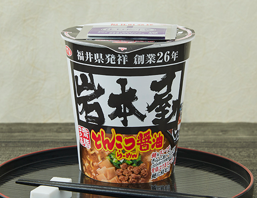 福井のローカルチェーン「らーめん岩本屋」監修。昨年好評のカップ麺がリニューアル!スープのこってり感醤油の風味も上げており麺もコシのある麺に改良しました。