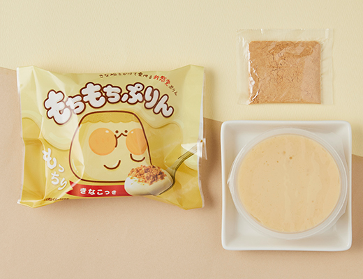 もちもちした食感のプリンに、きなこをかけて食べる新しいデザートです。