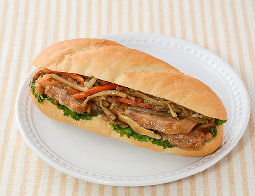 ソフトフランスパンに、照焼チキンときんぴらごぼう、グリーンレタスを合わせました。味のアクセントにゆず醤油マヨをしぼり、さっぱりとした味わいを楽しめます。