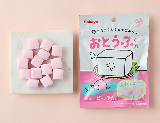 困り顔のおとうふくんを応援したくなる、酸味の効いたピーチ味の新商品。