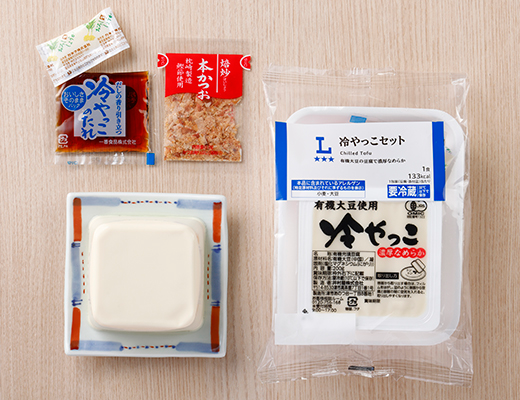 なめらかな食感のきぬ豆腐と、醤油たれ、おろし生姜、かつお節をセットにしました。