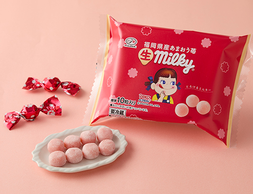 北海道産の生クリームと、福岡県産あまおう苺ジャムを練り込んだ生ミルキーです。