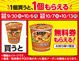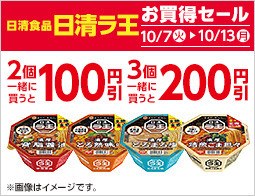 対象のカップ麺を2個同時購入で100円引、3個同時購入で200円引