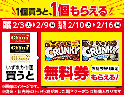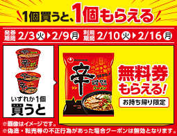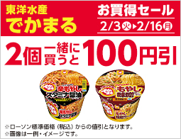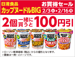 対象の即席食品を2個同時購入で100円引、3個同時購入で200円引