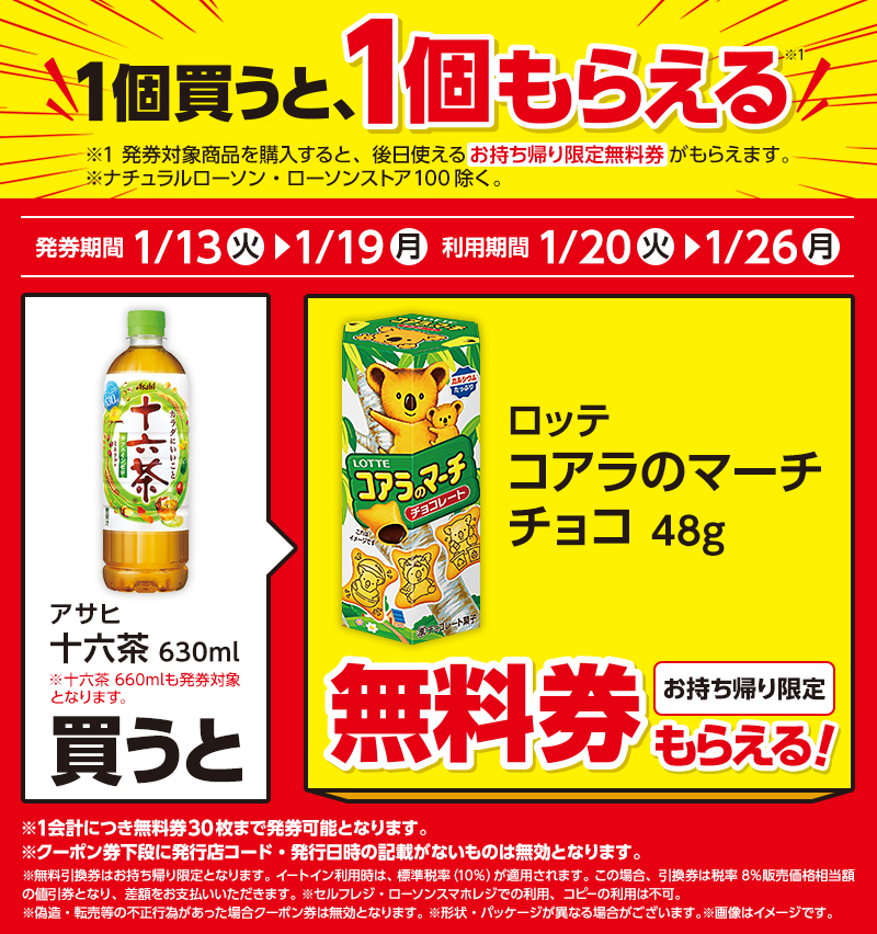 | ●下記対象商品を購入すると、無料クーポンがレシートについてきます。 レシート無料券 発券期間 1/13(火)〜1/19(月) |