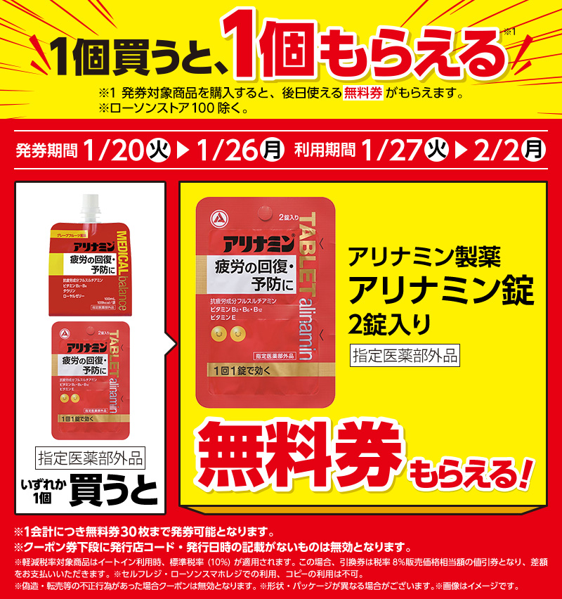 | ●下記対象商品を購入すると、無料クーポンがレシートについてきます。 レシート無料券 発券期間 1/20(火)〜1/26(月) |