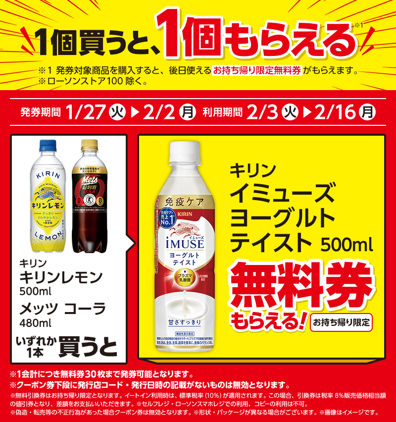| ●下記対象商品を購入すると、無料クーポンがレシートについてきます。 レシート無料券 発券期間 1/27(火)〜2/2(月) |