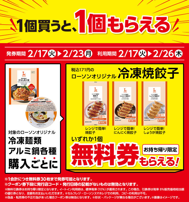 | ●引換券対象商品 レシート無料券 引換期間 2/17(火)〜2/26(木) |