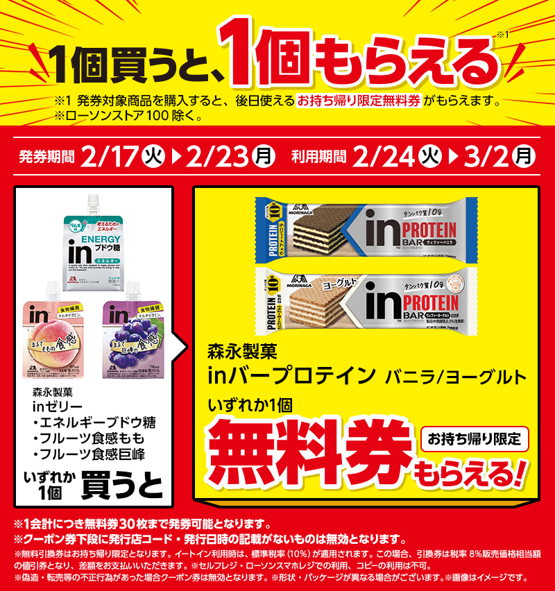 | ●下記対象商品を購入すると、無料クーポンがレシートについてきます。 レシート無料券 発券期間 2/17(火)〜2/23(月) |