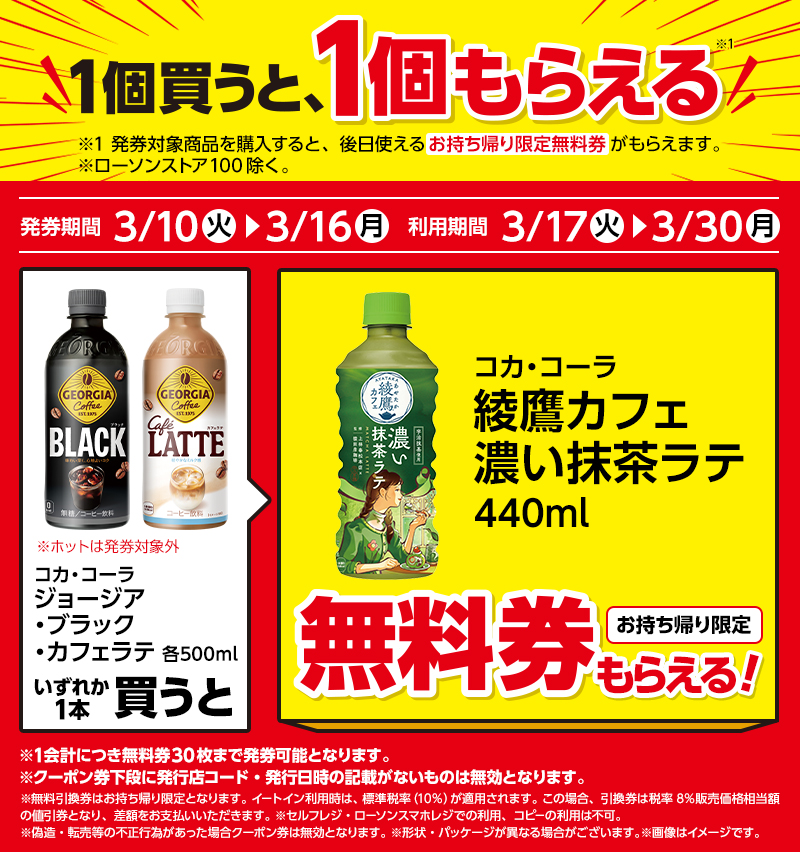 | ●下記対象商品を購入すると、無料クーポンがレシートについてきます。 レシート無料券 発券期間 3/10(火)〜3/16(月) |