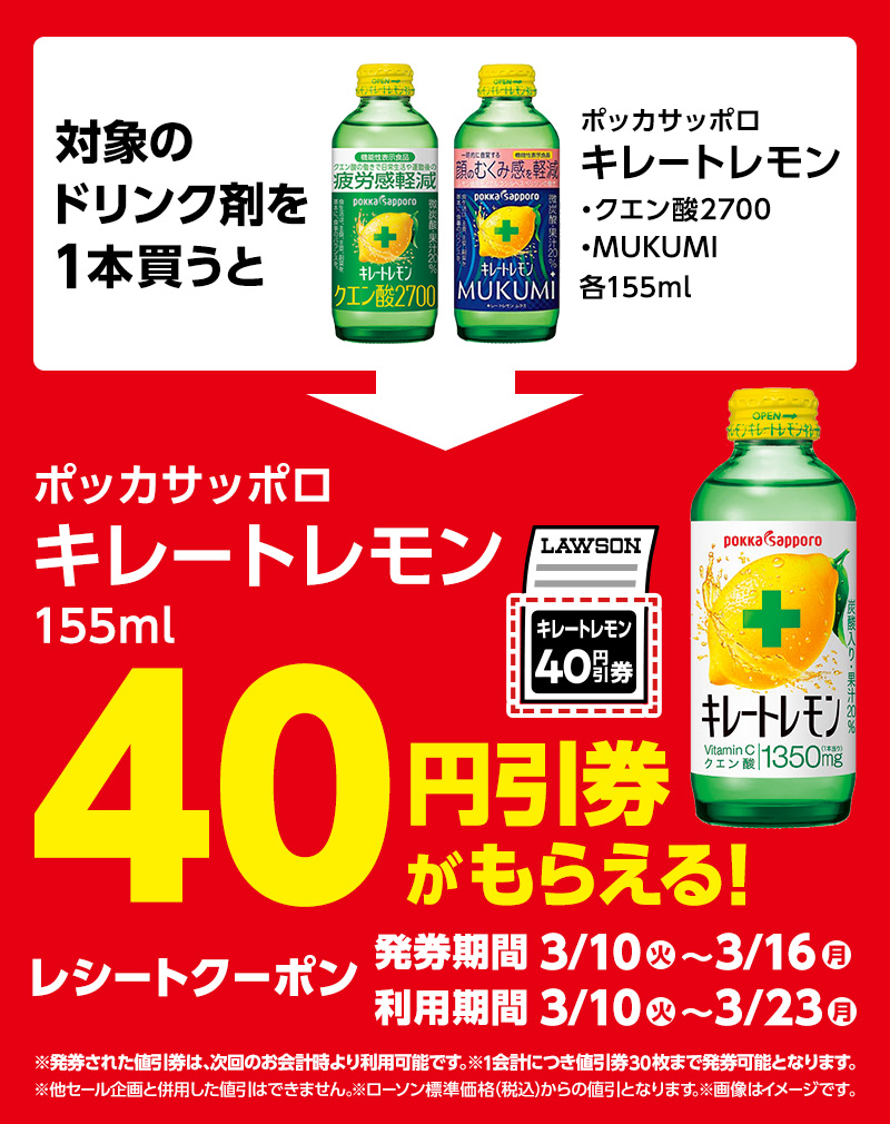 | ●下記対象商品を購入すると、40円引券がレシートについてきます。 レシート値引券 発券期間 3/10(火)〜3/16(月) |