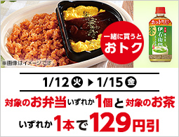 対象のお茶とお弁当を同時購入で129円引