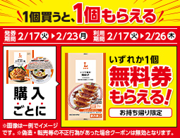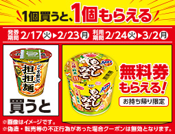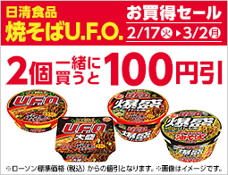 対象の即席食品を2個同時購入で100円引