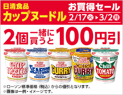 対象のカップ麺を2個同時購入で100円引