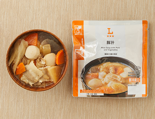 具材に豚肉・にんじん・ごぼう・大根・里芋・玉ねぎ・こんにゃくを使用しました。3種の合わせ味噌を使い、味わい深い豚汁に仕上げました。