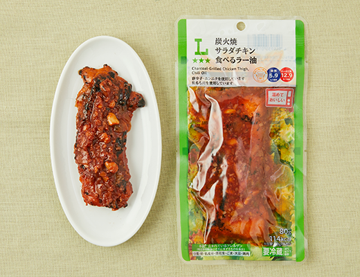 具材感あるラー油だれを乗せた、炭火焼きのサラダチキンです。
