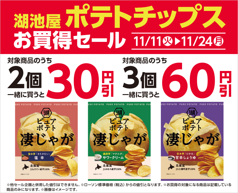 | ●下記対象商品のうち、2個一緒に買うと30円引、3個一緒に買うと60円引(税込) | |||